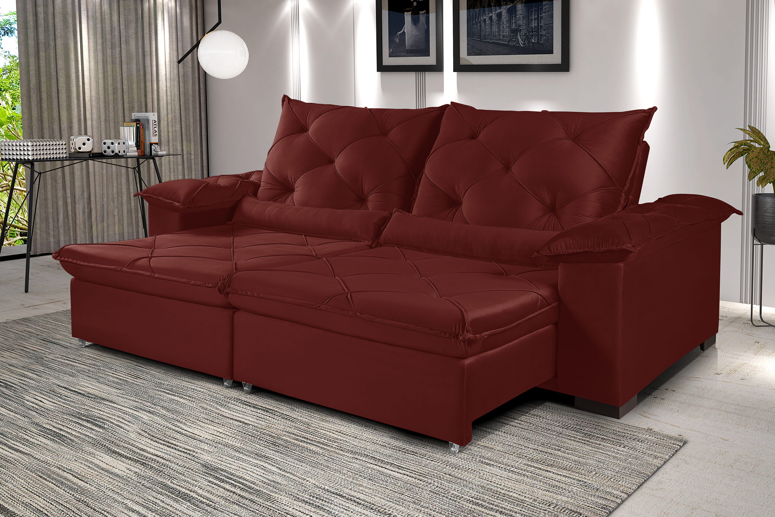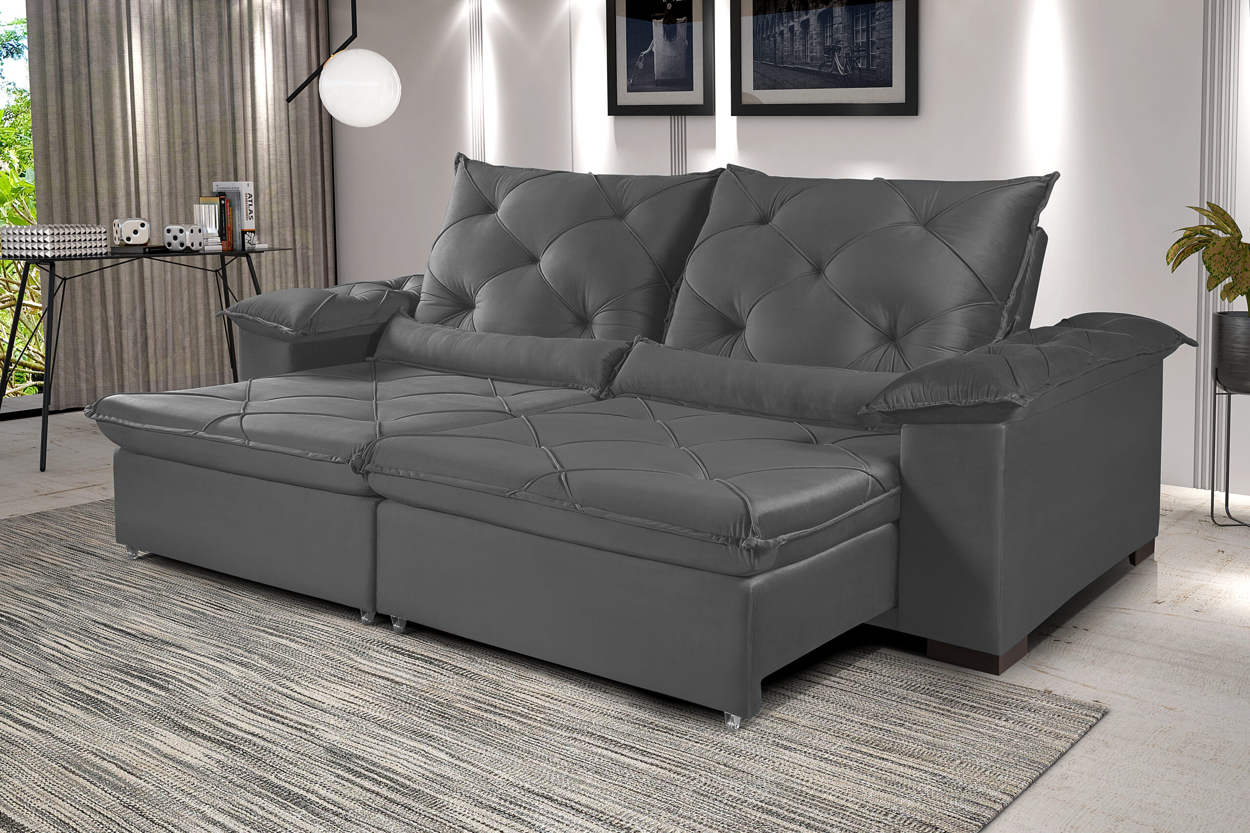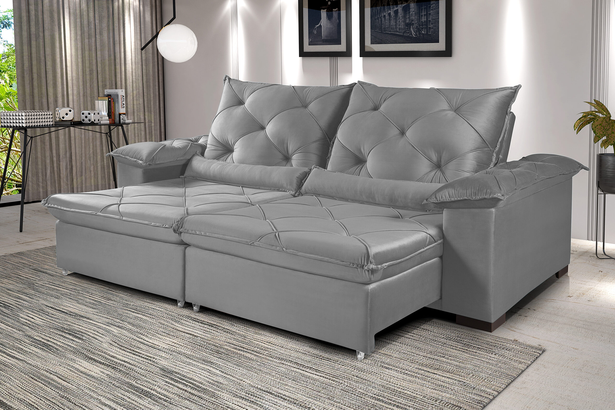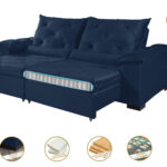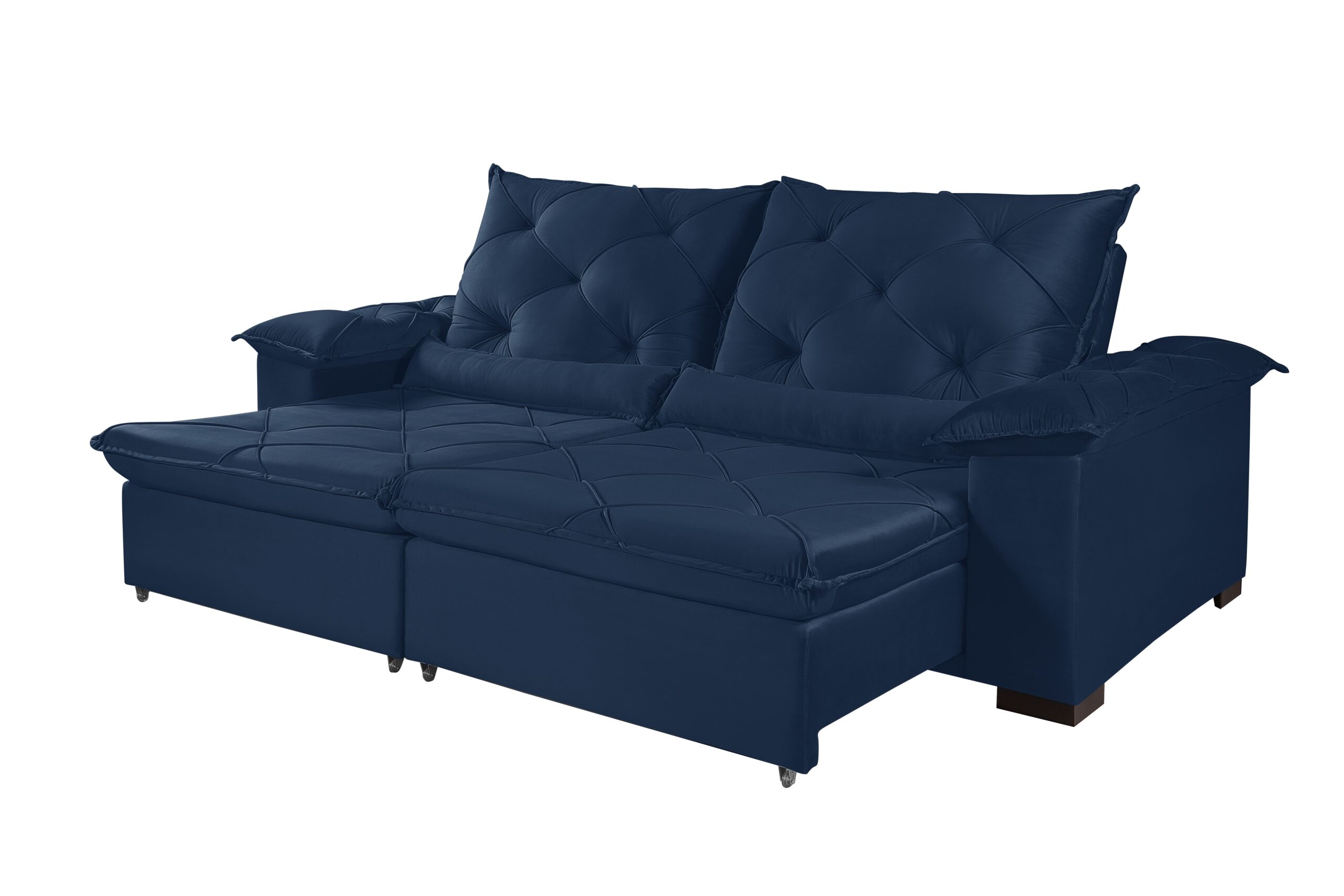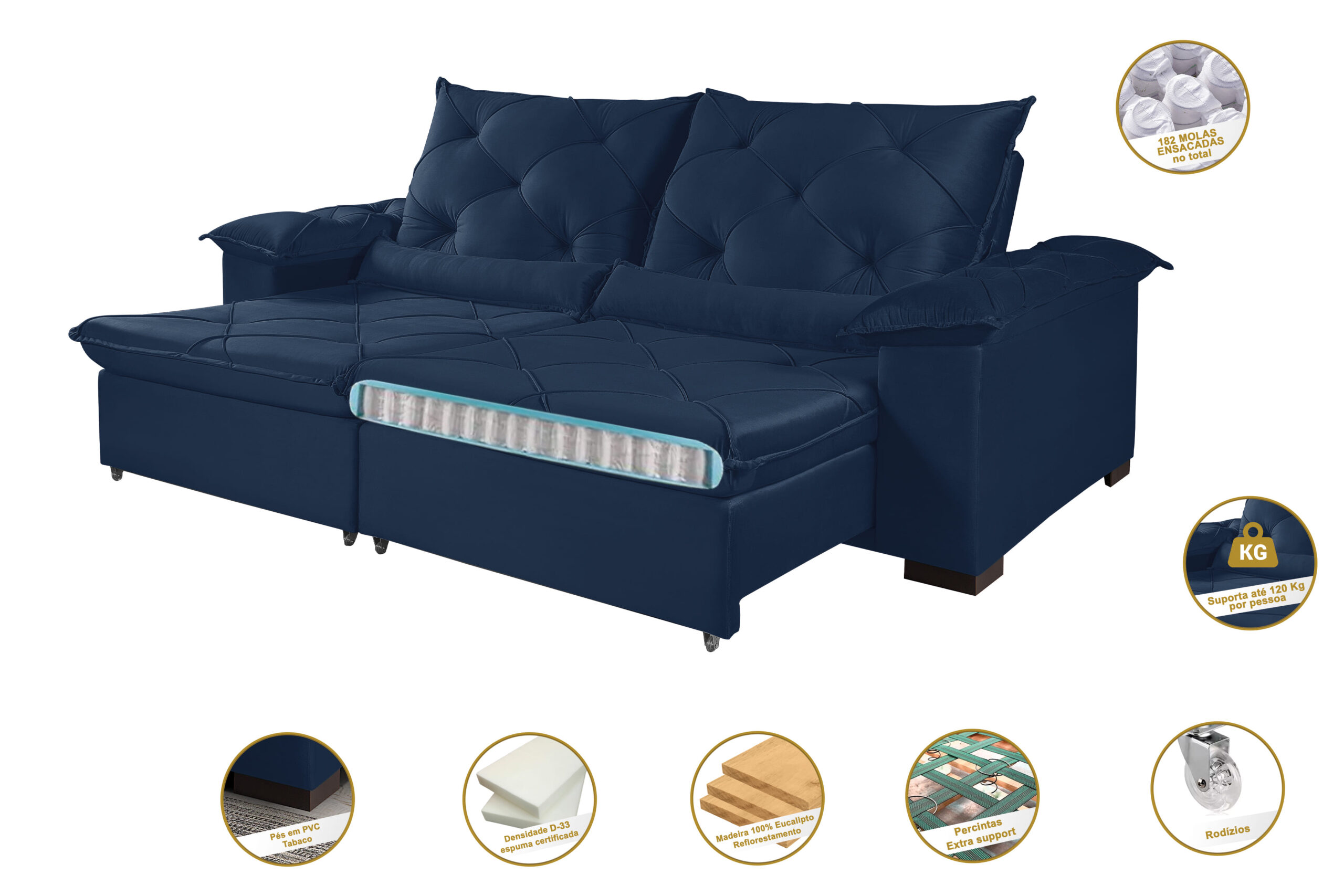 • Assento retrátil em espuma D-33, sustentação com cintas elásticas de alta resistência, molas ensacadas, corrediças metálicas tubulares com pillow de 15 cm.